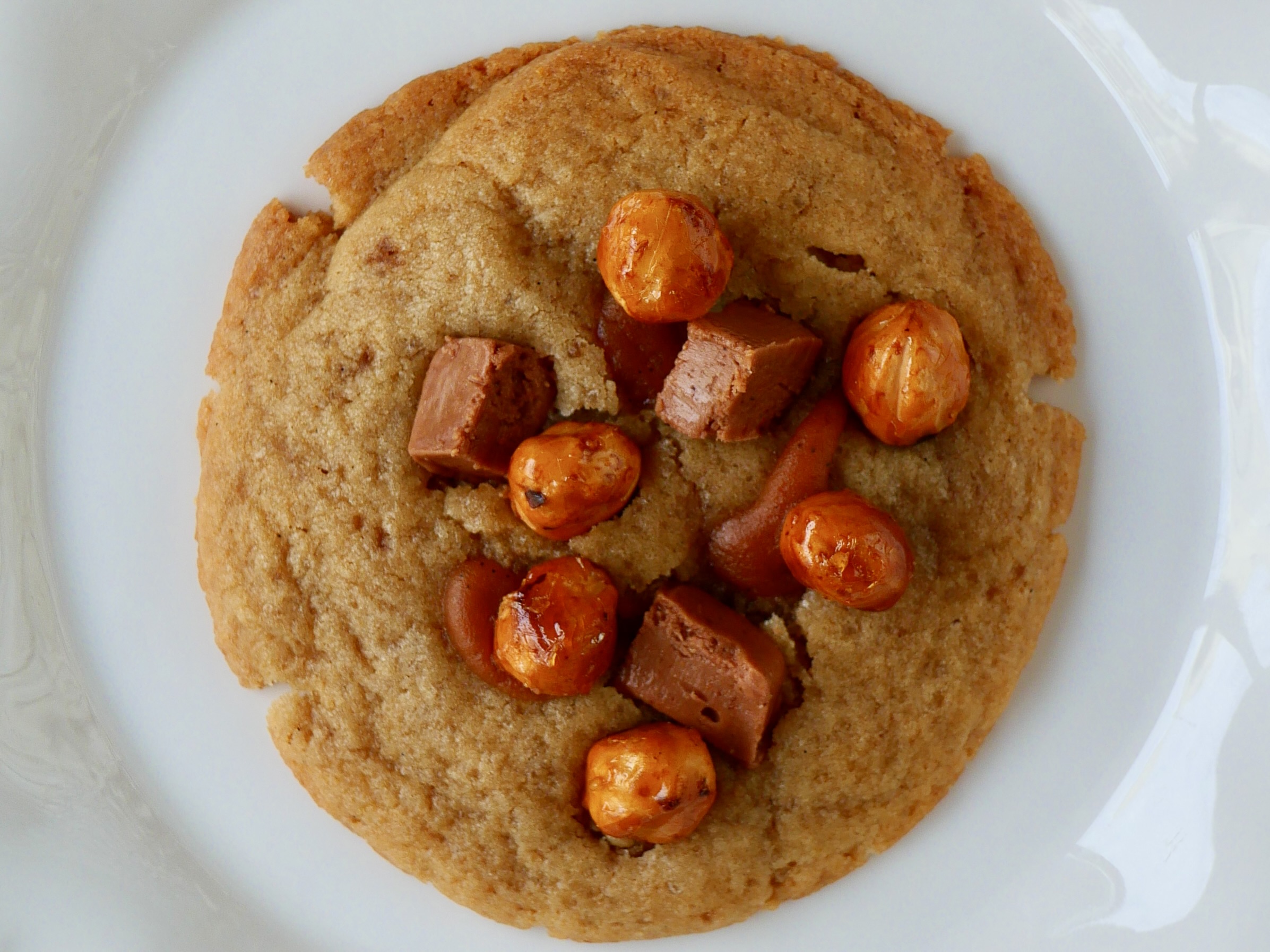 Cookie au Gianduja noisettes maison (chocolat au lait-noisettes), noisettes caramélisées maison et caramel à la vanille.
