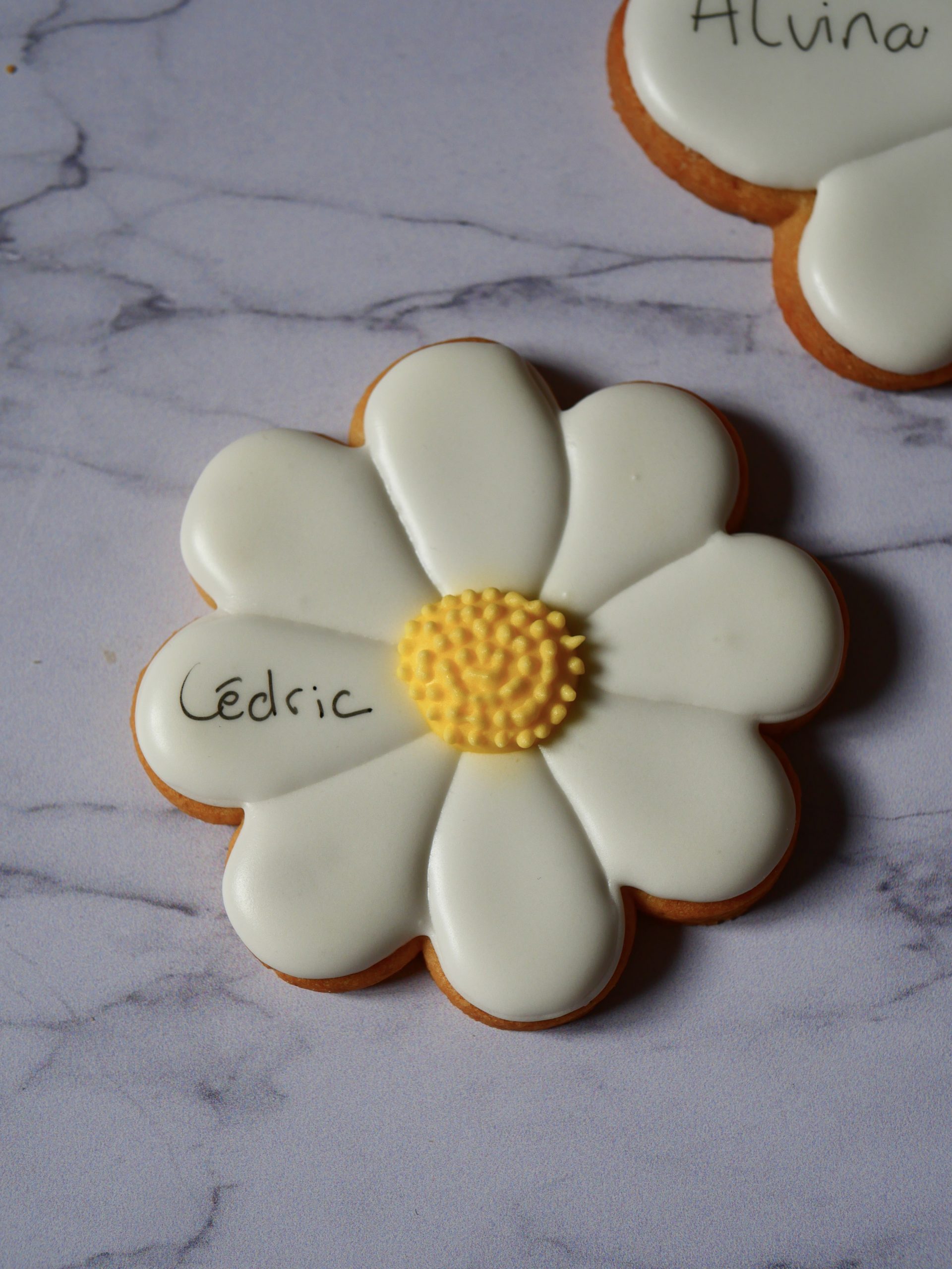 Les pétales de fleurs sont assez grands pour écrire un prénom de dessus. Ces biscuits marguerites feront de délicieux marque-places.