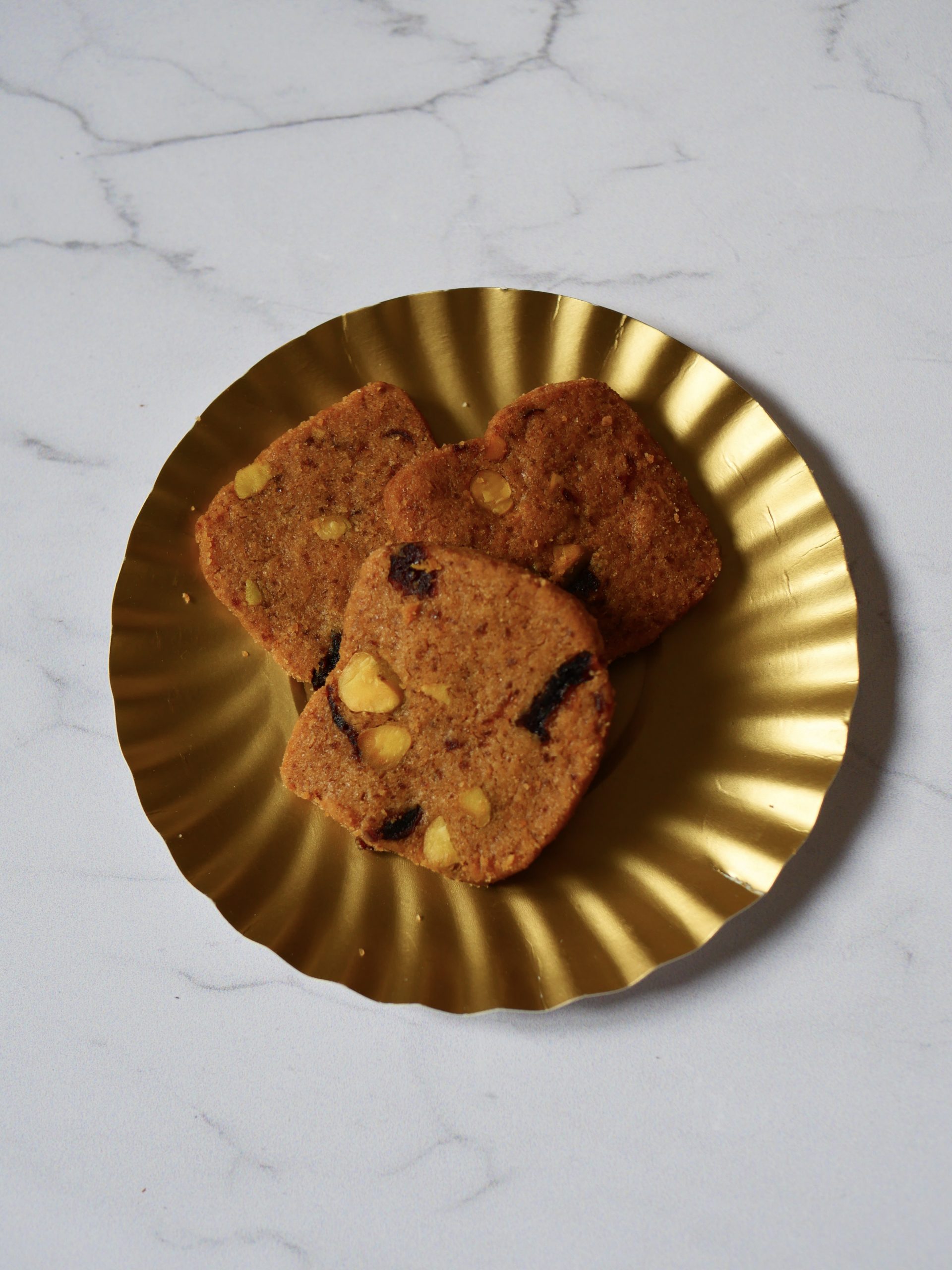 Ingrédients : farine de blé français, beurre AOP, vergeoise, pistaches, cranberries